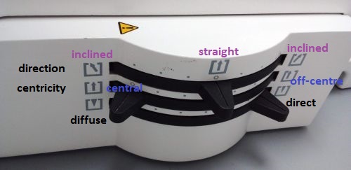 For oblique illumination use direct illumination and intermediate beam inclination and off-centricity
