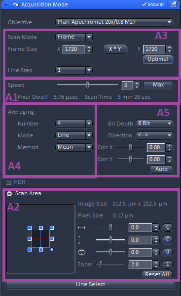 Pixel Dwell time and Scan Time (A1) are determined by scanning speed and Frame Size. Slower scanning increases Pixel Dwell and therefore the amount of signal collected in each pixel. For live samples is may be advisable to avoid very slow scanning (prolonged continuous exposure of the same area in the sample to laser light), but rather to increase the effective time per pixel by repeatedly scanning each line or the whole frame (A4).