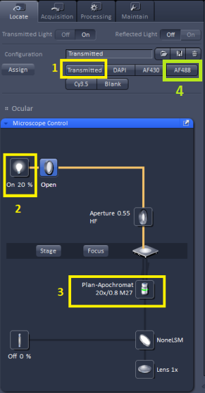 Locate tab in ZEN software is used to set up observation by the eyepiece. To observe the sample in transmitted light, select the appropriate observation mode (1). The transmitted lamp will turn on (2) and the shutter in front of the lamp will open; you can control its power in the software or using the knob at the base of the microscope body. The objective can be selected in the software (3) or using the touchscreen panel. See an important note on objective selection.