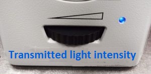 For observation of fluorescence, select the appropriate fluorescence channel (4) according to the fluorescent labelling of your sample; this will determine the filter cube that will be inserted into the path (5). The fluorescence lamp power can be controlled in the software (6), provided it has been switched on.