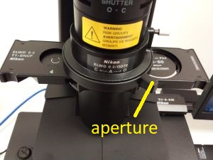 The slider for the condenser has two position - an empty one for brightfield and one with a rotating mask for Emboss contrast. Rotate the mask for optimum image appearance. The aperture slider has 4 positions - one labelled O for brightfield and then 3 positions for objectives of different magnifications (10x - 40x).